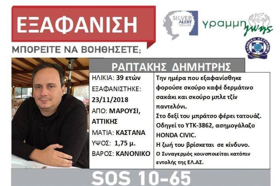 Πρόκειται για τον Δημήτρη Ραπτάκη από το Μαρούσι Αττικής, τα ίχνη του οποίου χάθηκαν από την Παρασκευή 23 Νοεμβρίου.
